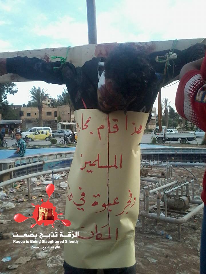 Aunque las imágenes no han sido verificadas, Abu Ibrahim Alrquaoui , el fundador de una asociación denominada 'Raqqa is Being Slaughtered Silently' (Raqqa está siendo masacrada silenciosamente) aseguró a la cadena Fox News que estuvo presente cuando las crucifixiones se llevaron a cabo y que fue él quien tomó las fotos que actualmente circulan por Internet.