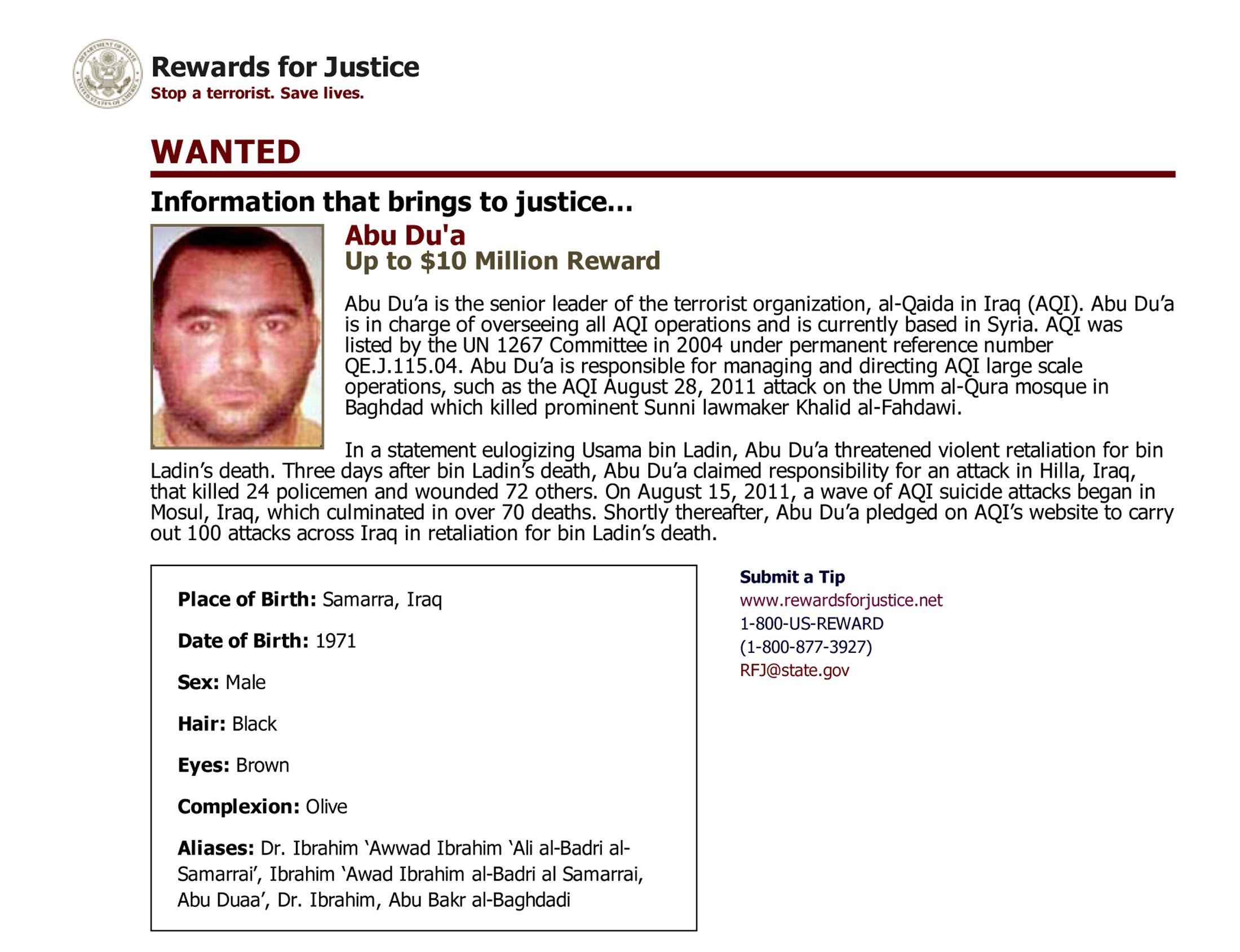 Según datos de la inteligencia de EE.UU., Al Baghdadi nació en 1971 en la ciudad iraquí de Samarra y obtuvo su doctorado en ley islámica en la Universidad de Bagdad. Se unió a las filas de los rebeldes después de que las tropas occidentales entraran en Irak en 2003. Durante mucho tiempo se creyó que había muerto en un ataque aéreo. En 2010 encabezó el Estado Islámico de Irak, tras el asesinato de su líder Abu Omar al-Baghdadi, y en 2011 logró unir este grupo con el Frente al Nusra formando así el Estado ISlamico de Irak y Levante. En 2011, el Departamento de Estado de EE.UU. ofreció una remuneracion de 10 millones de dólares por cualquier tipo de información sobre Al Baghdadi.